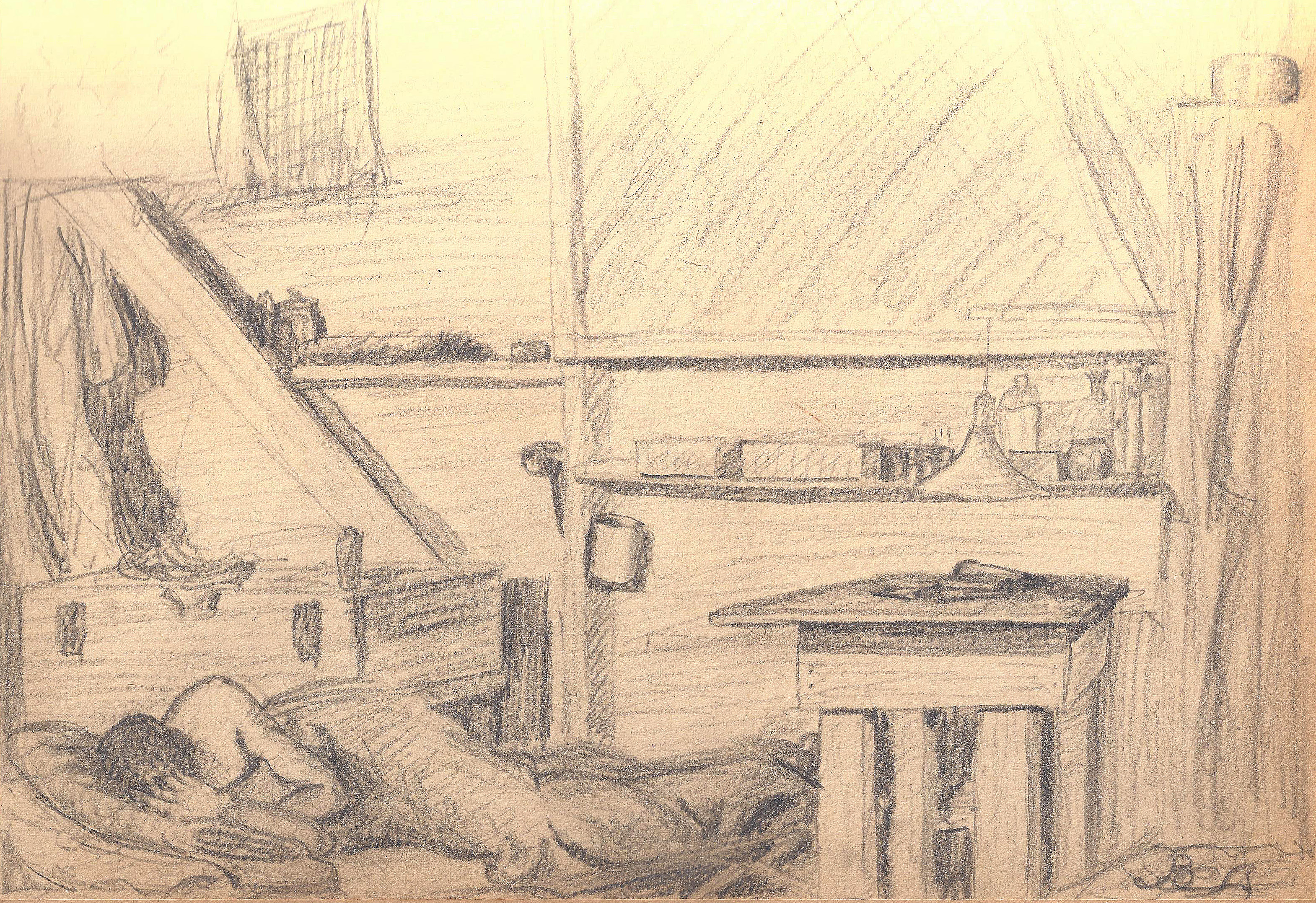 L to R: Dave Porterfield of 6C3, George Ehrlich of 6B6, Sparky Lawton of 6C3, Herk Pettis of 6B6middle row left: George inside the barracks, October 1945