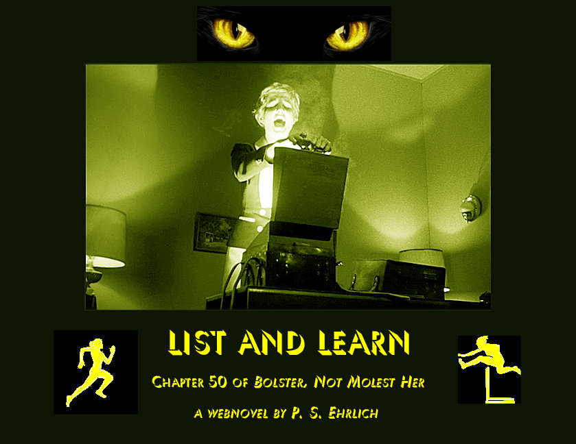 Rev-it-up rituals were going on in all eight lanes: touching toes, hopping around, stepping side to side, leg lifts and kicks. Eileen, divested of her pocket spiral, was visibly jittery (snort by unsympathetic S-Q) and Vicki had a brief wild hope of getting subbed in, even though she’d rather have that happen with the shorter straighter 110-yard event regardless of its barriers being three inches higher. No such luck, of course; “On your mark!” was announced and Eileen hunkered down, stepping into her starting block as did the other seven girls. “Get set!”—eight backsides were raised (Vicki reflexively tugging a wedgie out of her own) for Split-Pea to FLASSSHHHH flassshhhh flassshhhh at—