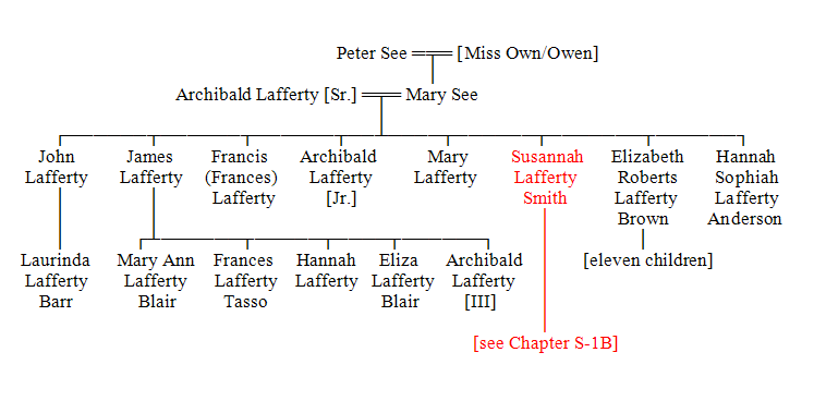 Circa 1791 Mary See married Archibald Lafferty [Sr.], who was born in New Castle County on Nov. 21, 1750 (or 1755). They had at least eight children, seven of whose names are provided by ~f: